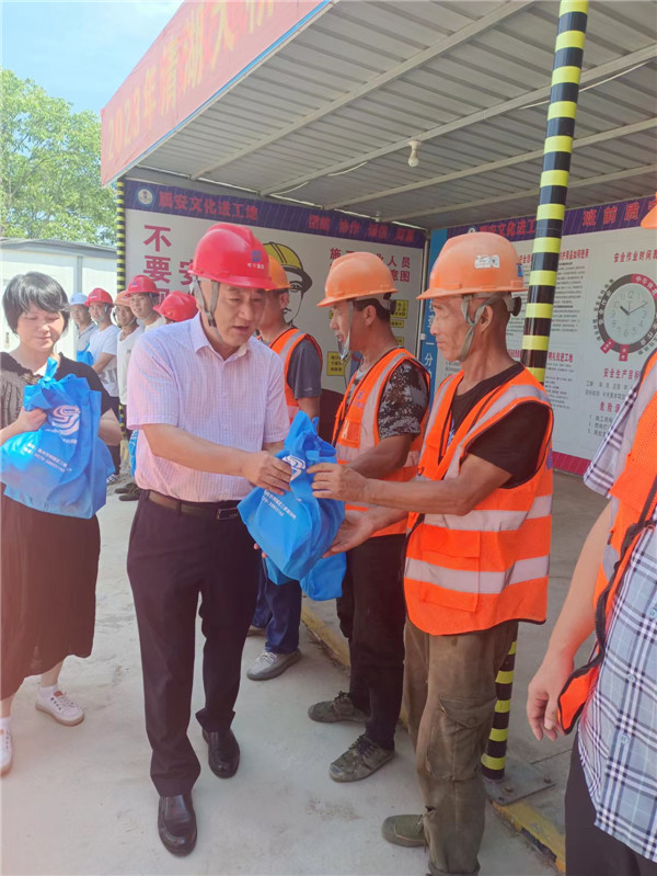 7月1日起,集团董事长李元水、总经理肖华勇等领导带领工会、安全部等有关部门负责人,分赴211省道江山市清湖大桥及接线工程项目部、六春湖上山应急救援道路工程项目部 、预制场等地,慰问奋战在一线岗位的员工们和现场施工人员,为他们送去毛巾、沐浴露、肥皂、藿香正气胶囊及饮料等防暑降温“礼包”。