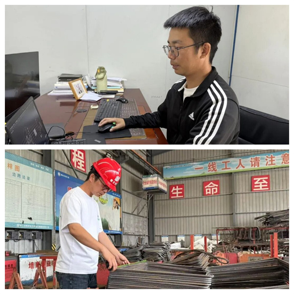 作为团队的技术负责领头人,徐建的每一天都在与毫米级的精度较量,他的电脑屏幕永远亮着CAD图纸和计算表格,表格里密密麻麻的数据记录着每片梁板的“生命密码”。核对完最后一项数据,他立刻抓起安全帽赶往车间。在机械轰鸣的生产线上,他蹲下身,用手向工人比划:“这个预埋件的位置要再调整2公分,否则后期安装会有偏差。”汗水顺着安全帽带滑落,他却浑然不觉,只知道全神贯注地盯着每一个细节。