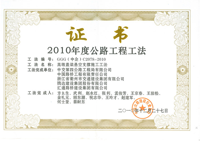 2010年度公路工程工法——高墩盖梁悬空支撑施工工法
